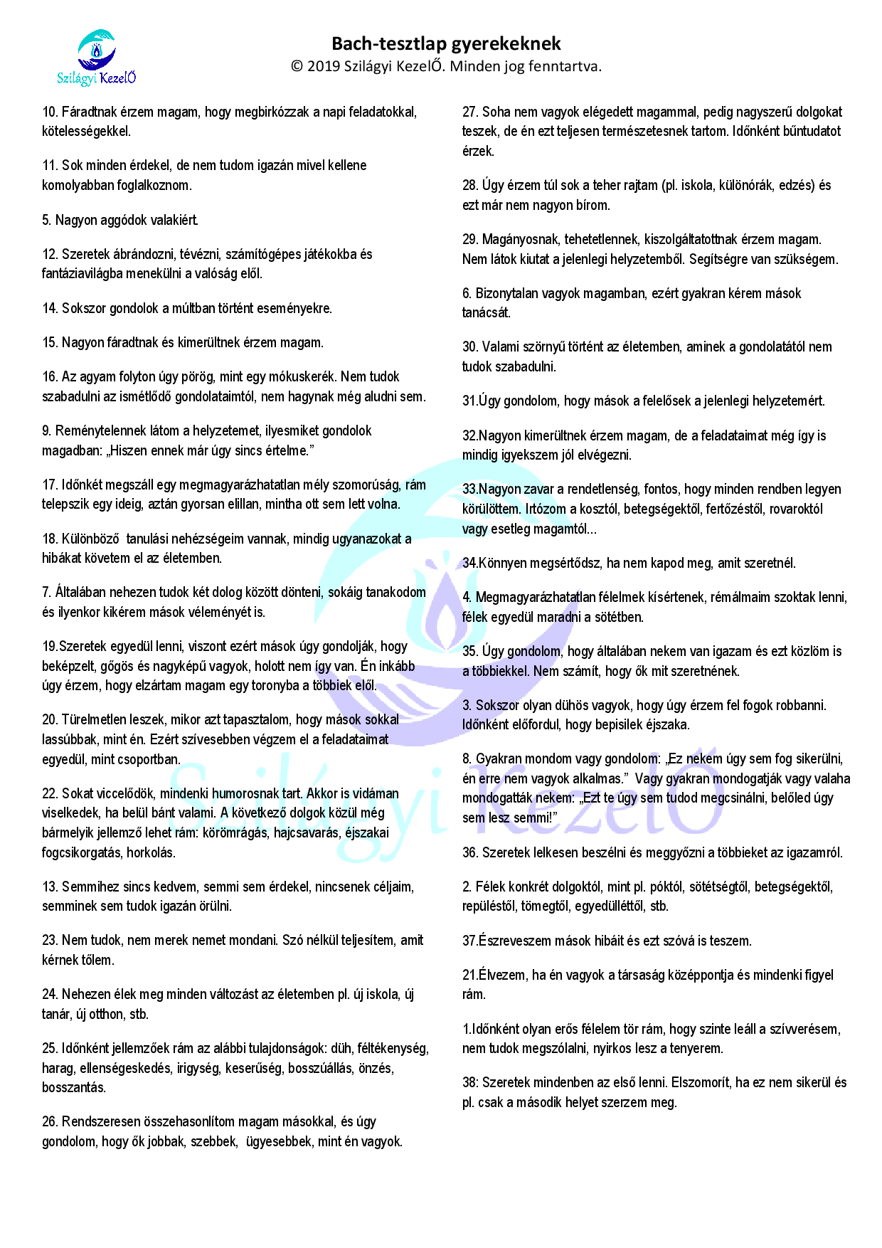 túlzott félelmek és aggodalmak, függőségek, céltalanság, gyász és trauma feldolgozása, önbizalomhiány, reménytelenség, magányosság, döntésképtelenség, testi-lelki kimerültség, túlterheltség, türelmetlenség, apátia, pánik, bűntudat, harag, féltékenység, beszédzavarok ( pl. dadogás), tanulási nehézségek, vizsgadrukk, beilleszkedési problémák, figyelem zavarok, tikkelés, gyerekek éjszakai bepisilése stb.